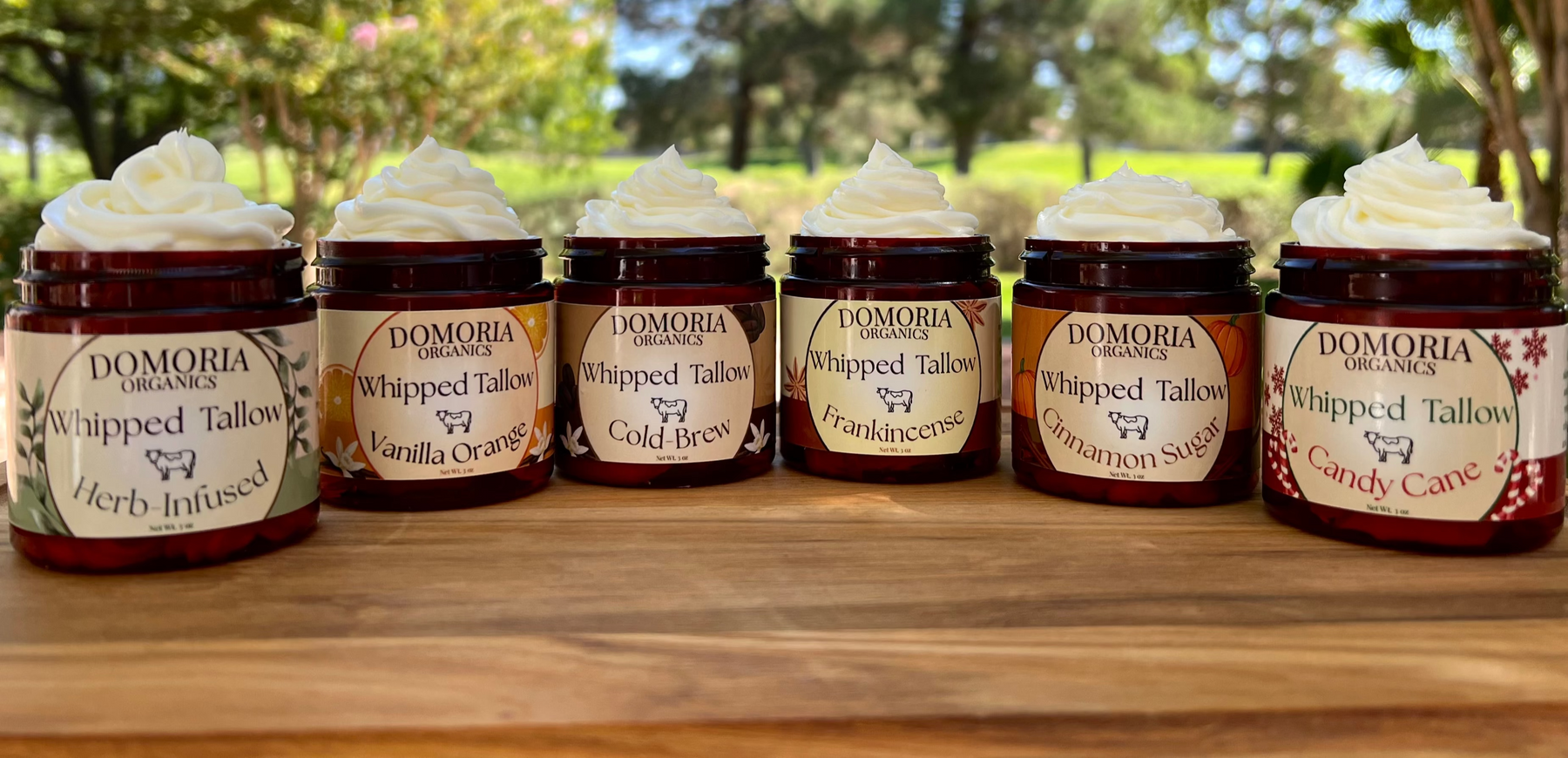 Jar of Domoria Organics Whipped Tallow Vanilla Orange on a wooden surface with oranges and vanilla beans.